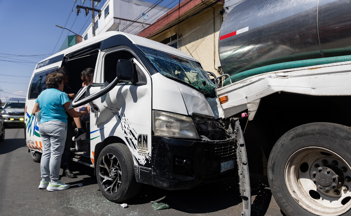 Ecatepec, Méx. Una unidad de transporte público se impactó contra una pipa de agua que estaba estacionada sobre la calle Morelos, en el centro de San Cristóbal, y 10 usuarios resultaron heridos, entre ellos el operador, quien quedó atrapado en el interior.