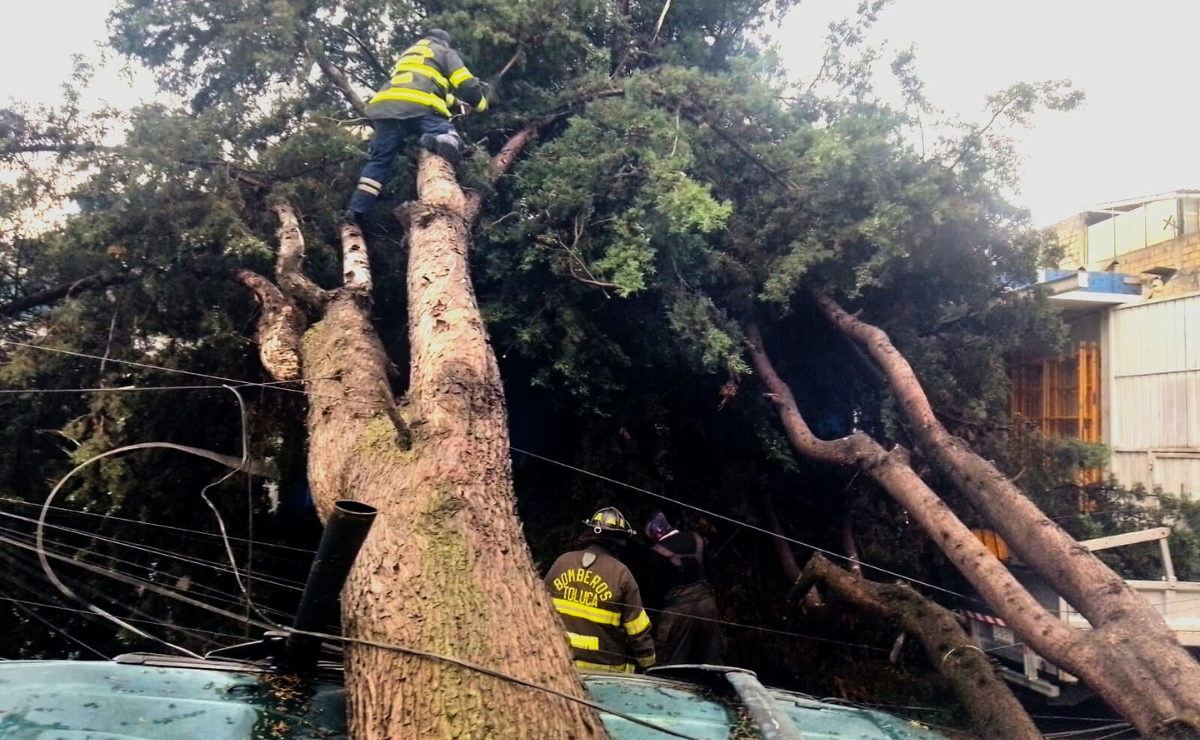 Toluca, Méx. La tarde de este lunes, las lluvias en Toluca provocaron la caída de un árbol en la calle Guillermo Prieto, afectando un vehículo estacionado y causando un corte temporal de energía. De forma simultánea, otro árbol colapsó en la zona de San Cayetano Morelos.